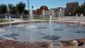 Fuente seca en Almería, cinco surtidores agua cristalina con focos RGB IP68, control de bombas mediante autómata programable